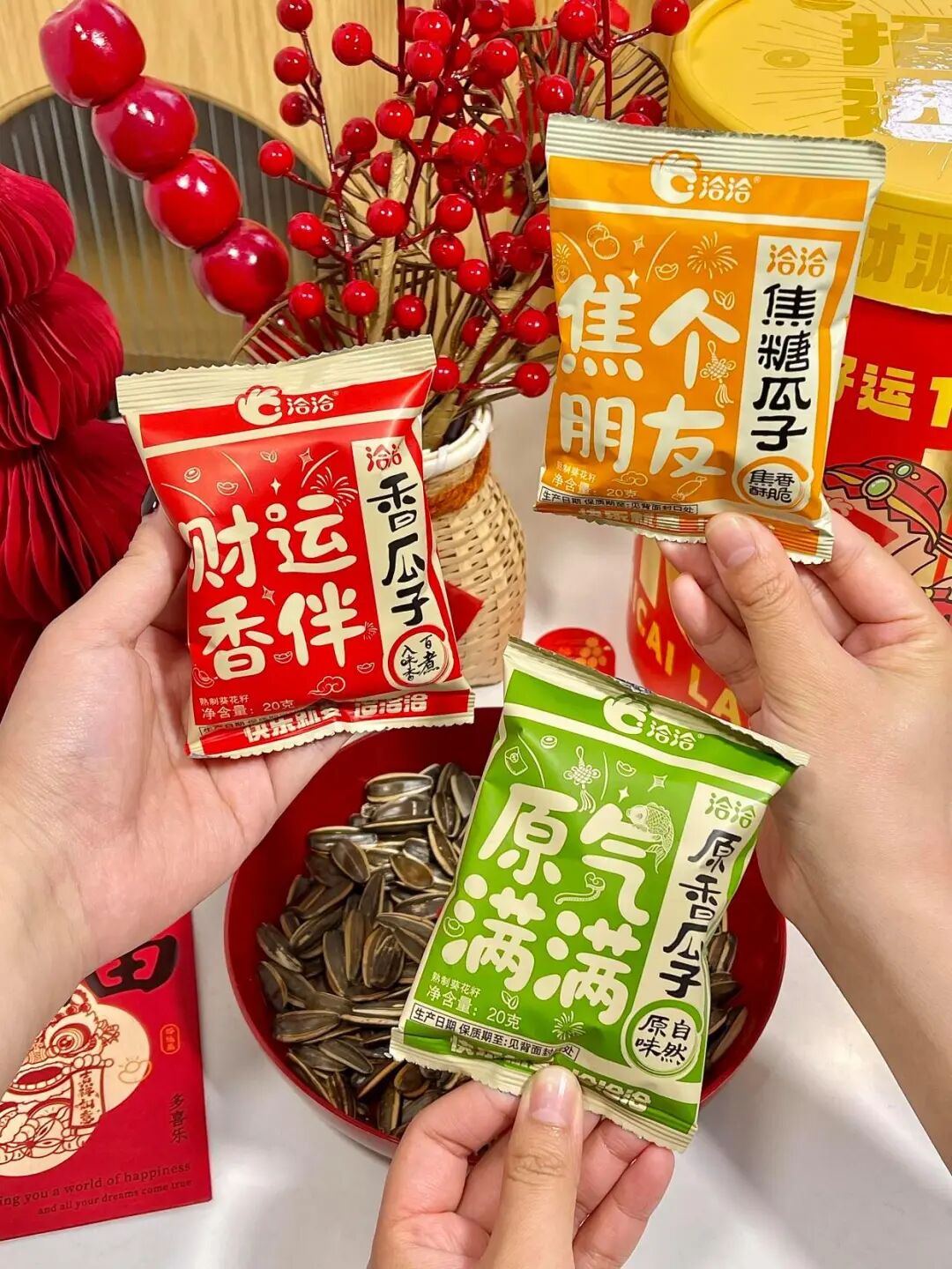即便是买普通的瓜子,他们也倾向这种新年专属的,寓意更好,对新年氛围感也能衬托得更到位。