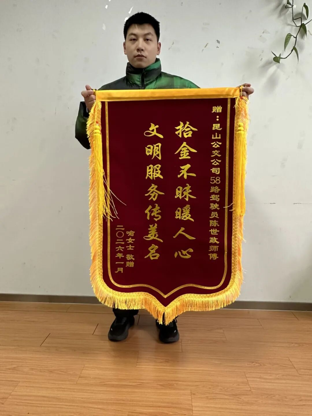 1月9日晚上,乘客喻女士乘坐公交58路,下车时不慎将电脑遗忘在公交车上。驾驶员陈世政到达终点站,打扫车厢卫生时在座位上发现了电脑包,他立即向车队报备情况并进行妥善保管。第二天喻女士拨打公交服务热线寻找电脑,得知被驾驶员拾获并妥善保管,便与驾驶员约定好站台并顺利取回电脑。1月20日下午,乘客喻女士的家人送来了一面写有“拾金不昧暖人心 文明服务传美名”的锦旗,感谢58路驾驶员陈世政拾金不昧的善举。