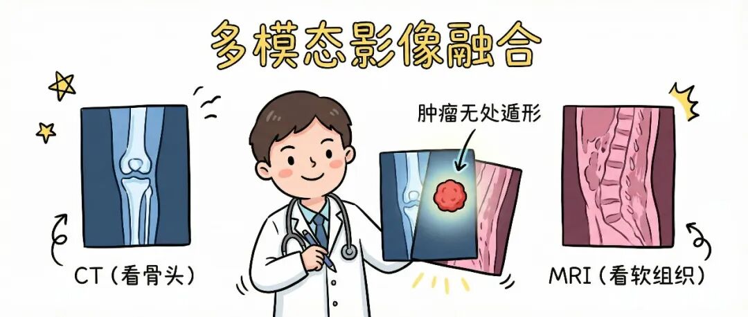 “多模态影像融合”:简单说,就是把CT(看骨头清楚)和MRI(看软组织清楚)等多张片子叠在一起看,像“透视眼”一样,让肿瘤边界无处遁形,医生画靶区更准。