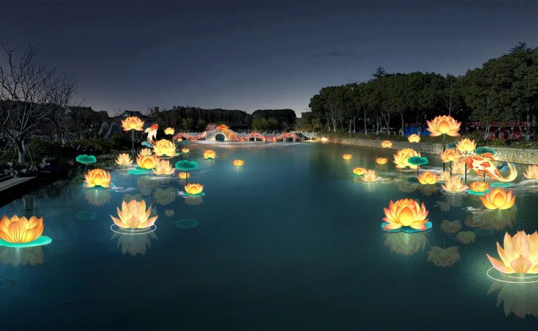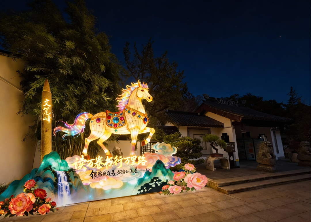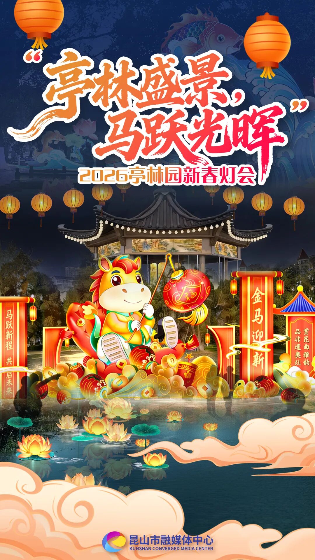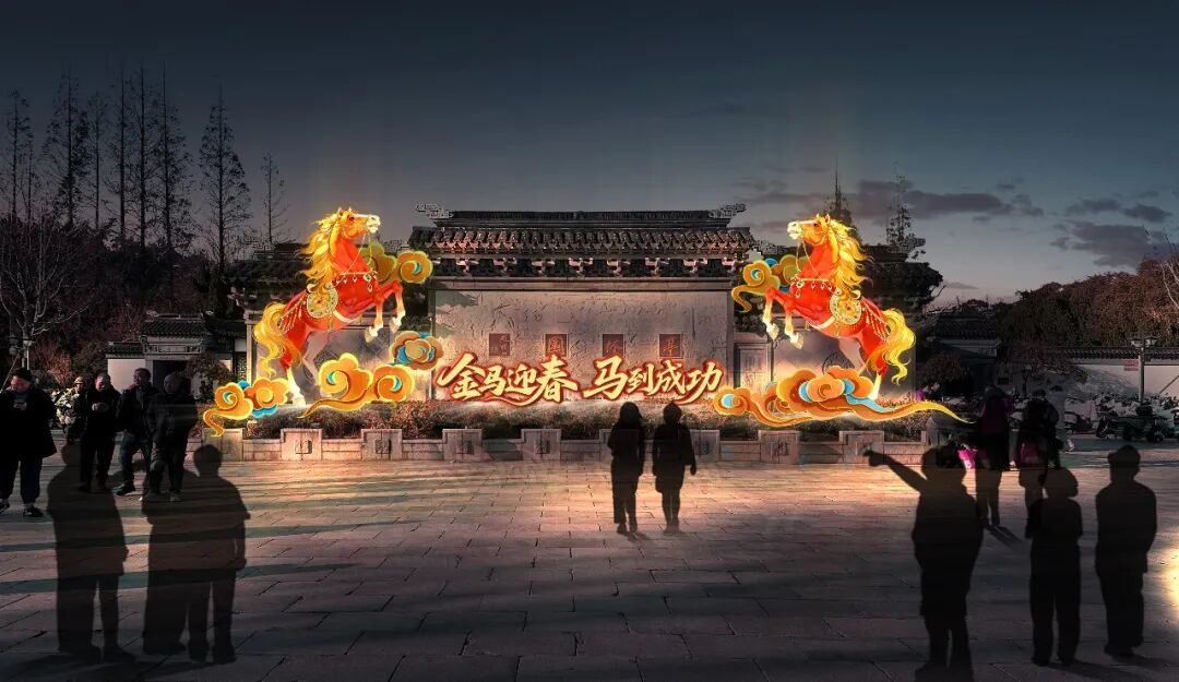 东大门牌楼下“金马迎春,马到成功”昂扬启新程;顾炎武纪念馆前“玉马追光”融君子风骨与治学精神;“五狮镇园,各守一方”合非遗与当代美学,暗合“五福临门”;留晖亭畔“琼华缀古意”以灯影衬古建,勾勒出江南诗画夜景;养馀园内“马上有咖位”联结昆山“咖都”文化,寓咖位福气双至、“夜经济”蓬勃发展;龙泉水面“锦鲤载福”莲鱼灯影摇曳,尽显水乡灵动韵味。