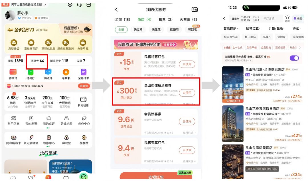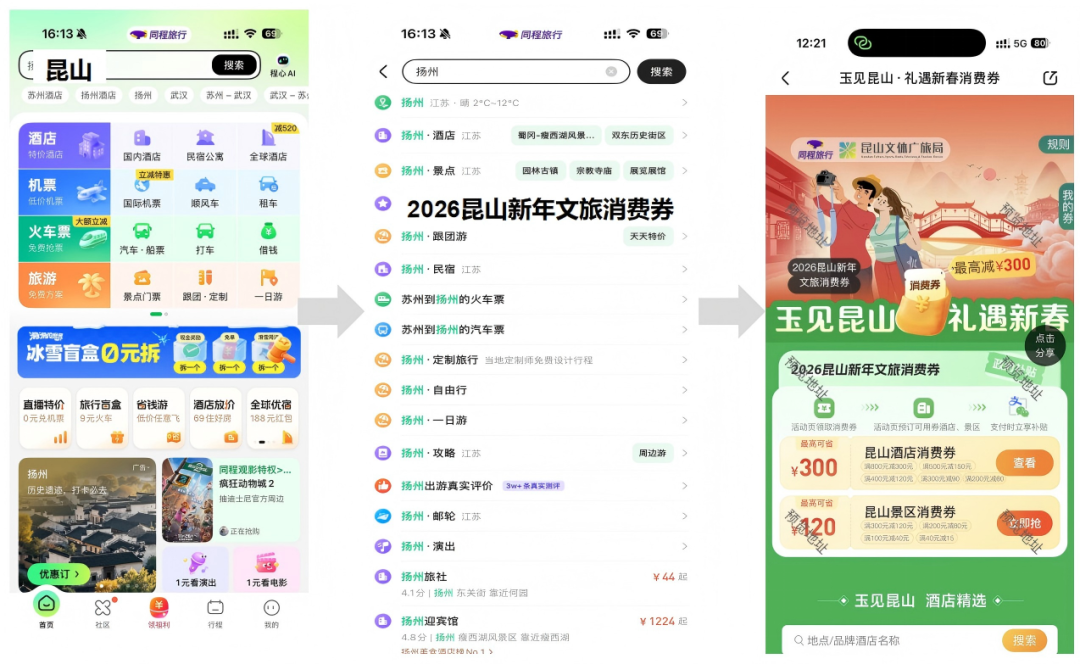 活动期间,进入同程旅行APP/小程序,首页搜索框输入“昆山消费券”“昆山”“昆山文旅消费券”等关键词,进入昆山新年文旅消费券活动专题页。