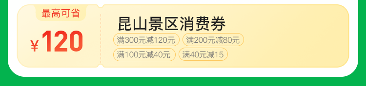景区券:满300元减120元、满200元减80元、满100元减40元、满40元减15元。