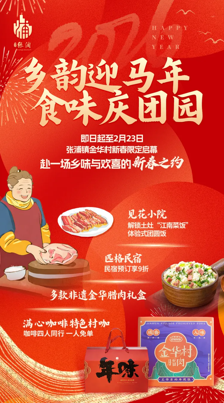 张浦镇金华村新春限定启幕啦!见花小院解锁土灶“江南菜饭”体验式团圆饭,零下柒度窑烤面包满3送1,匹格潮派民宿预订享9折,还有多款非遗金华腊肉礼盒、特色村咖(咖啡四人同行,一人免单)体验同步上线,赴一场乡味与欢喜的新春之约。