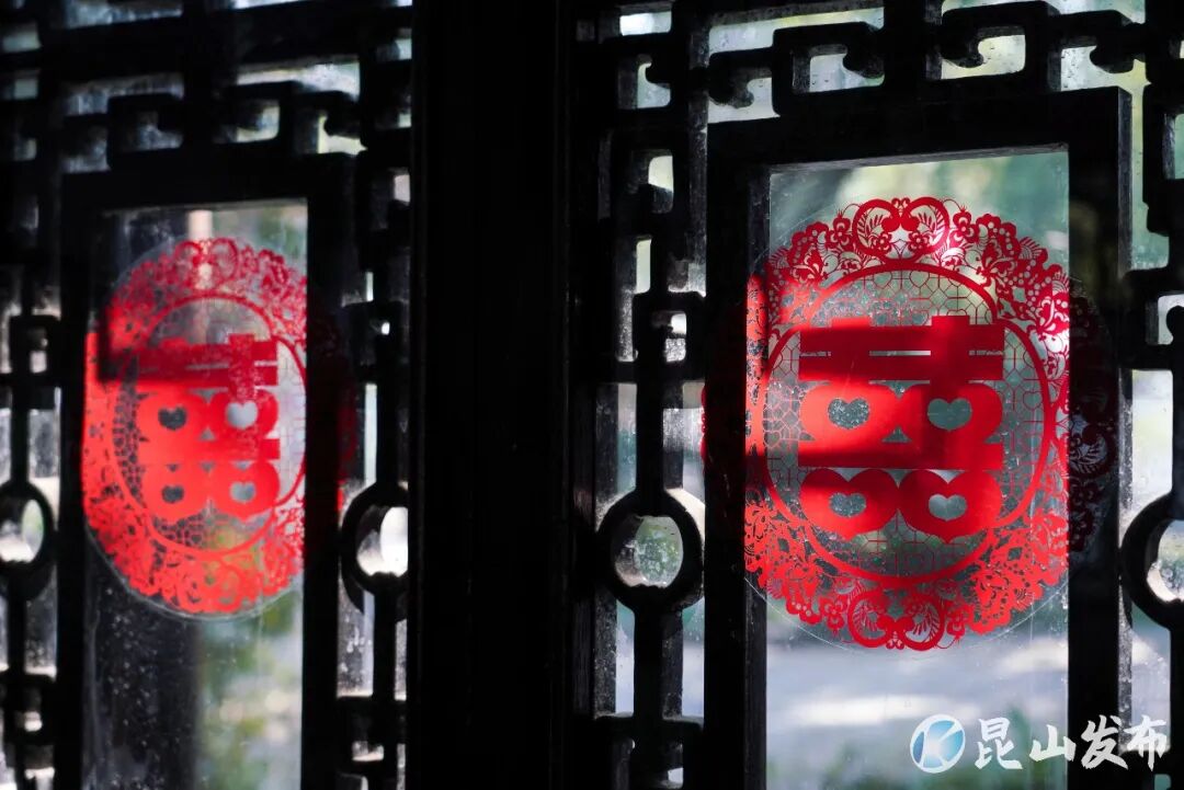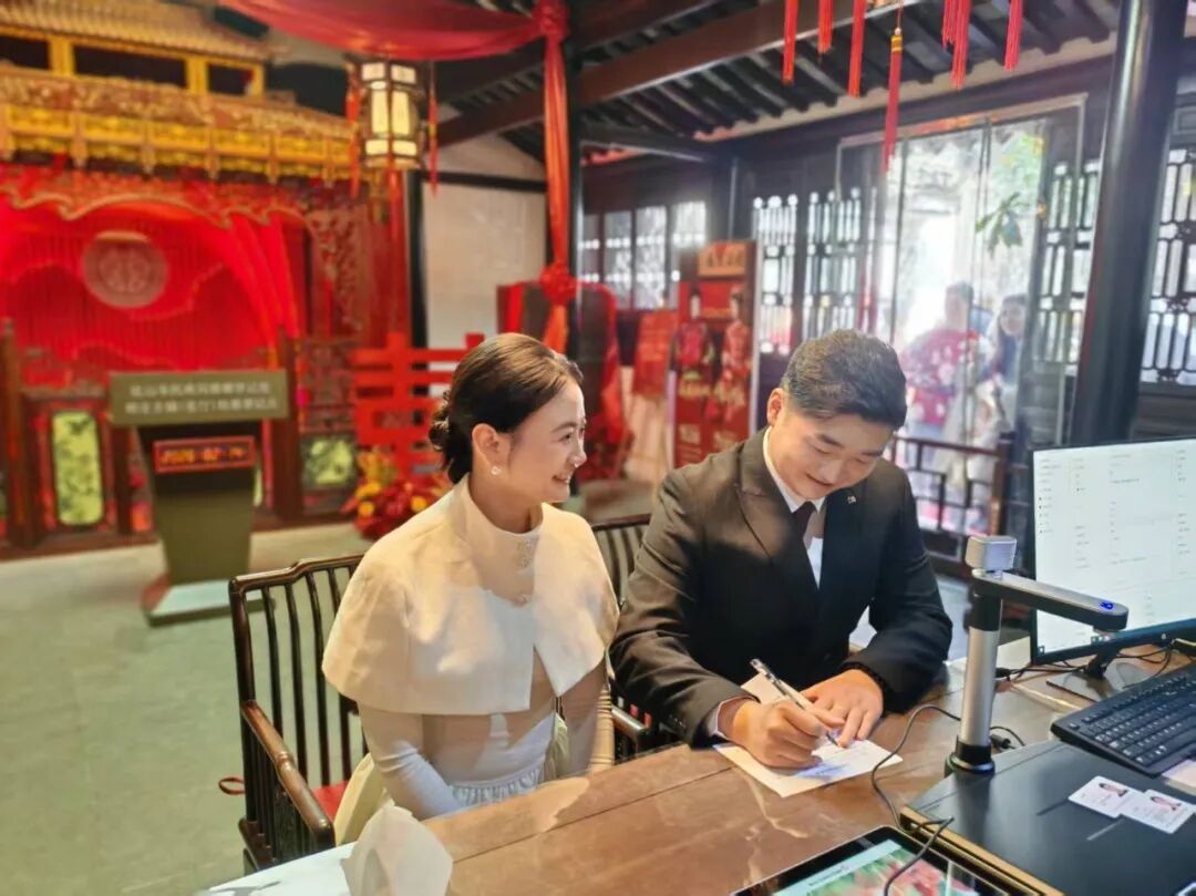 亭林园婚姻登记点位于菉竹居,依托江南园林风貌打造,白墙黛瓦、绿意环绕,将传统婚俗文化与自然景观融为一体,是昆山独具特色的户外园林式颁证场所。当天一早,不少新人便结伴前来,在工作人员的引导下有序完成登记、宣誓、颁证等流程。现场布置简约喜庆,木质门扉上的大红“囍”字,与背景墙的水墨荷花相映成趣,工作人员为每一对新人送上诚挚的祝福,温馨的氛围让整个登记过程充满仪式感与幸福感。