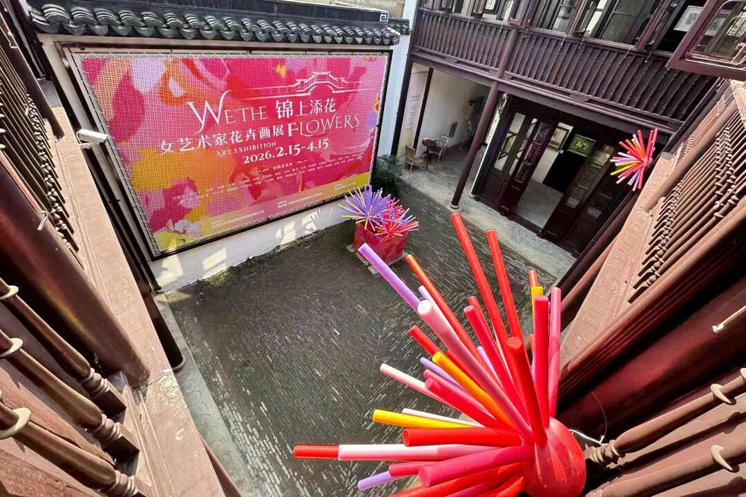 2月15日,春节长假第一天,锦溪古镇人头攒动。穿过始建于明永乐年间的天水桥,陈墓区公所旧址西式拱券门楼前,人们三三两两驻足。门内,民国老建筑的木地板吱呀作响,由36位昆山女画家带来的“锦上添花”花卉主题画展,把这座220平方米的省级文保单位,变成了一个花香墨韵交织的新春艺术客厅。