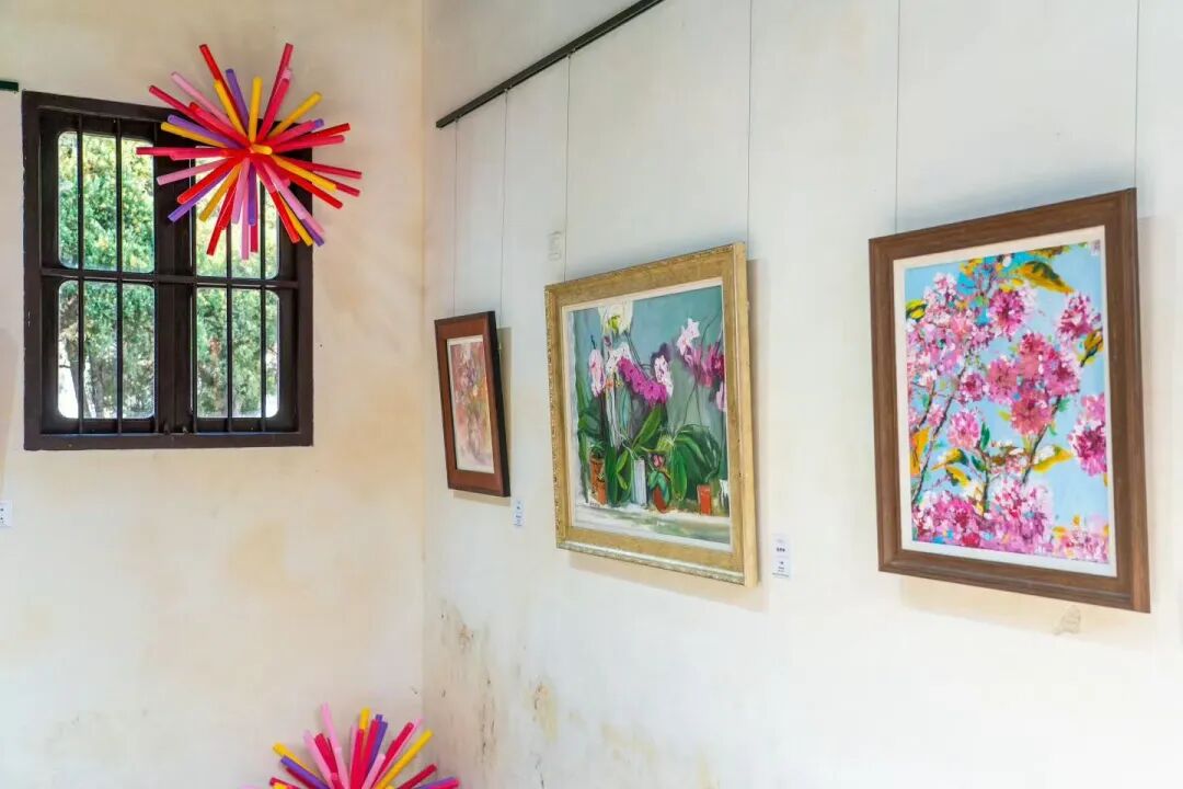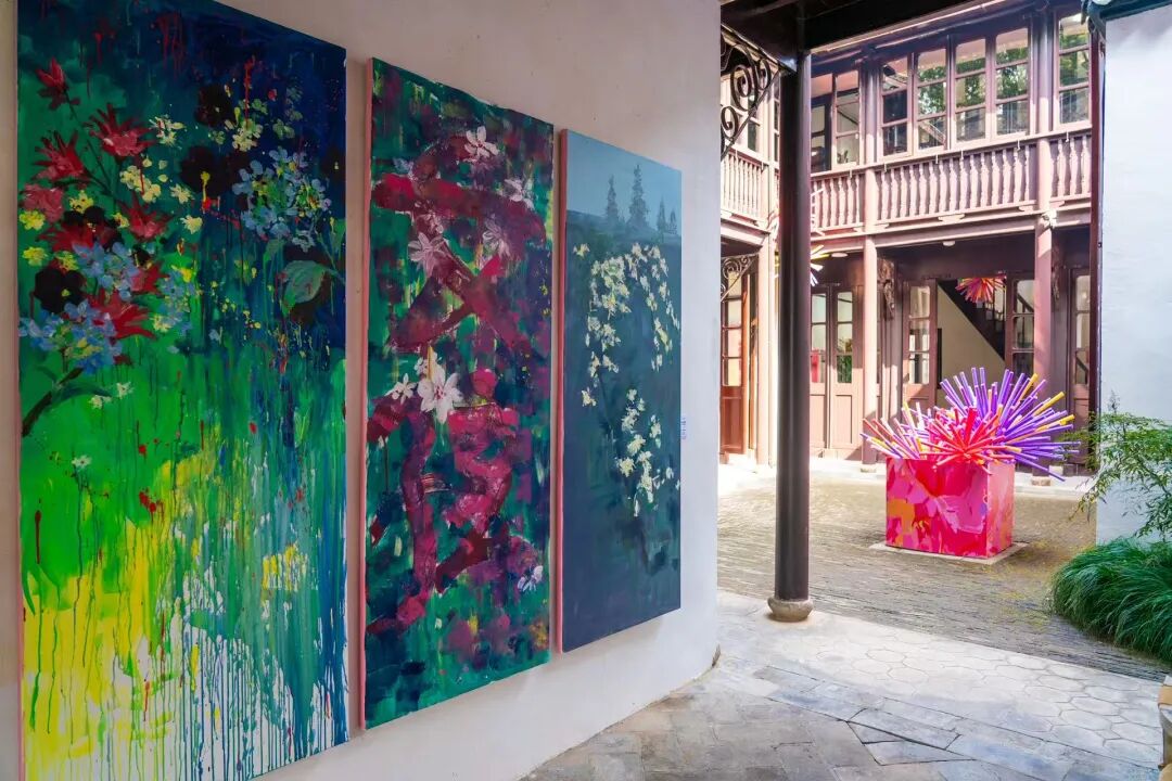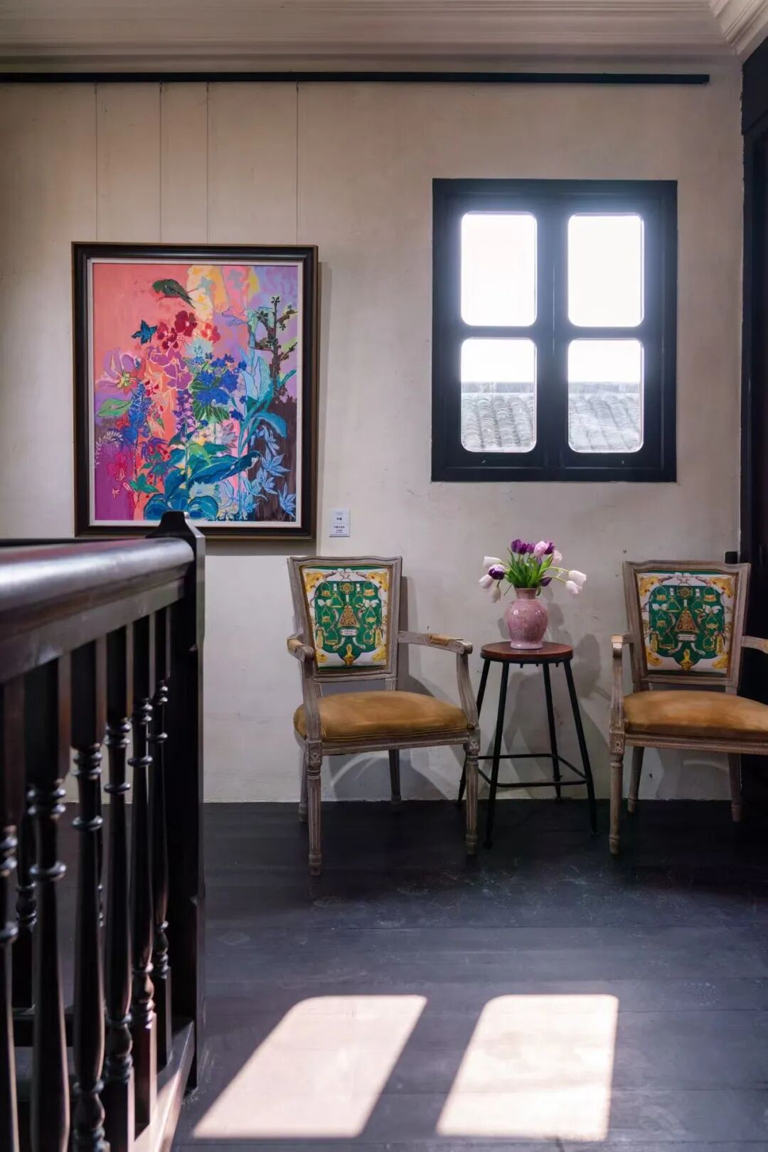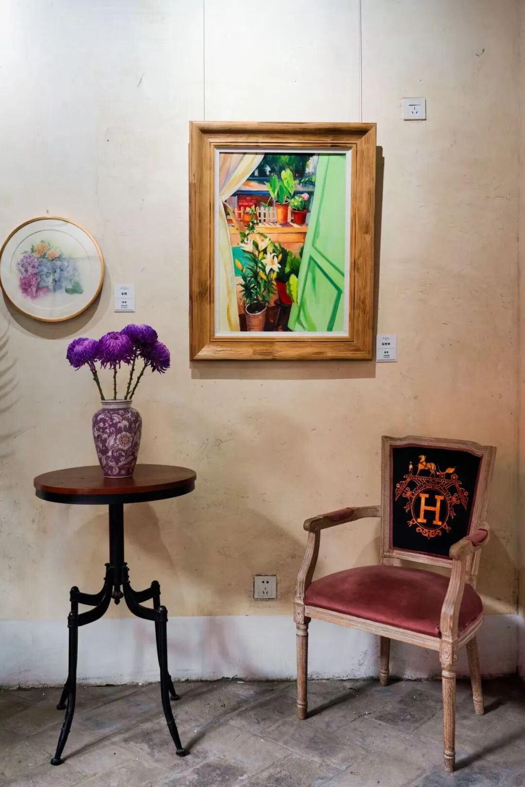 院内是木结构的二层楼房,斑驳的墙壁前,欧式古典家具和老旧瓷器静静伫立。环视墙上,一朵朵秀气灵动的鲜花正“开”得热烈。