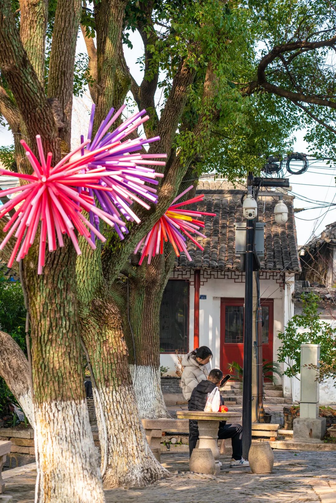 区公所门外,香樟树上挂满了彩色烟花装置。那是女画家们带着孩子,用网上买的彩色海绵条,“手搓”出来的。风吹过,彩色“烟花”轻轻摇曳,像童年的梦,也像新春的祝愿。
