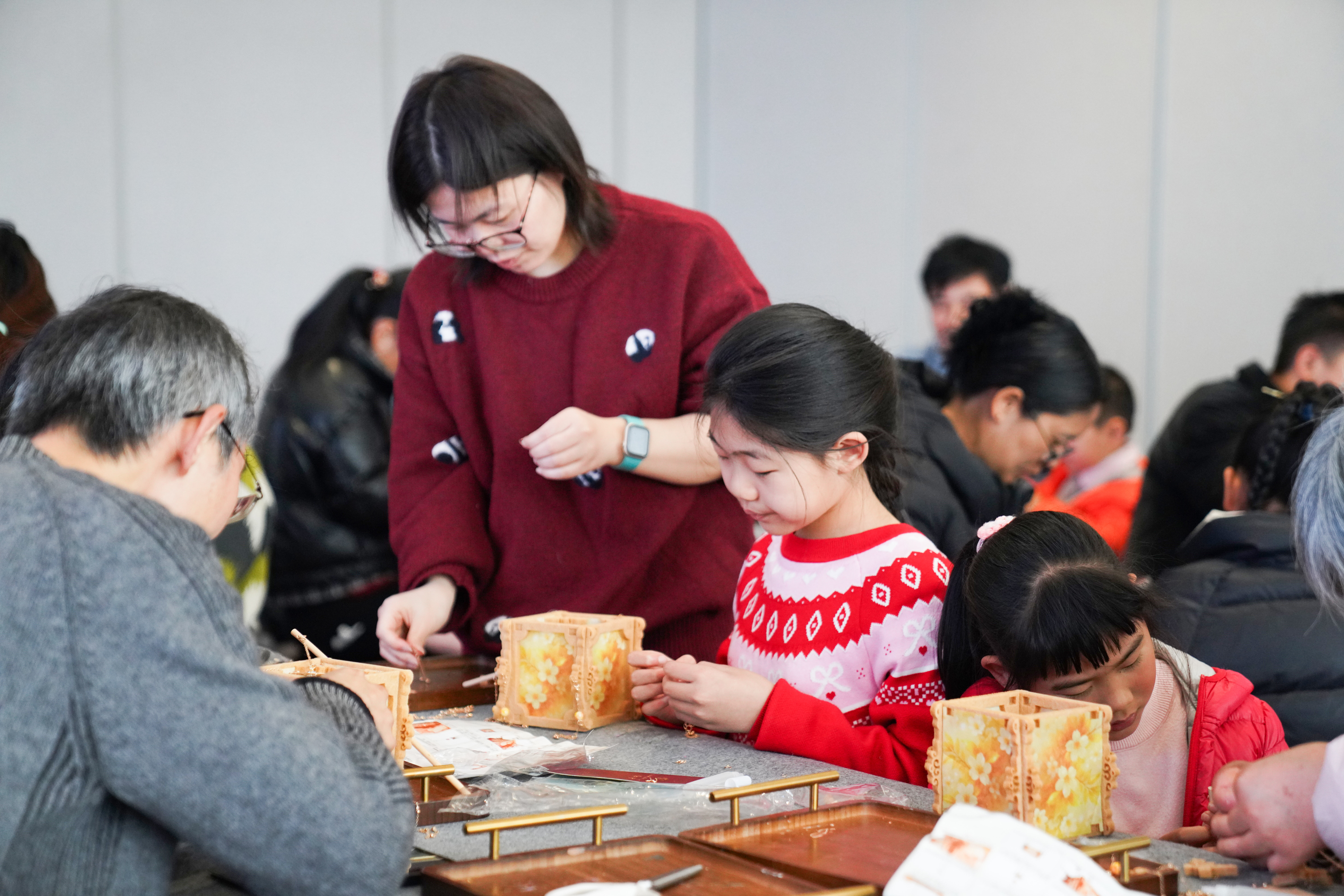 与猜灯谜的热闹相映成趣的,是一旁“元宵制灯记”工作坊里的温馨场景。孩子们在父母的陪伴下,正聚精会神地制作花灯。五岁的悠悠在妈妈的帮助下,正小心翼翼地给一盏莲花灯糊上彩纸,他举着半成品骄傲地说:“我要做一盏最亮的灯,提着它去看戏!”灯光映照着孩子专注的脸庞,也让非遗技艺在指尖的协作中温暖传承。