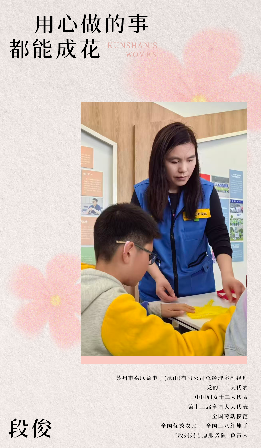从车间到会场,从岗位到公益,段俊的每一步都走得踏实而坚定。面对荣誉,她始终保持初心如磐:“昆山给了我追梦的舞台,我愿用毕生之力,回馈这座城市,温暖更多人。”