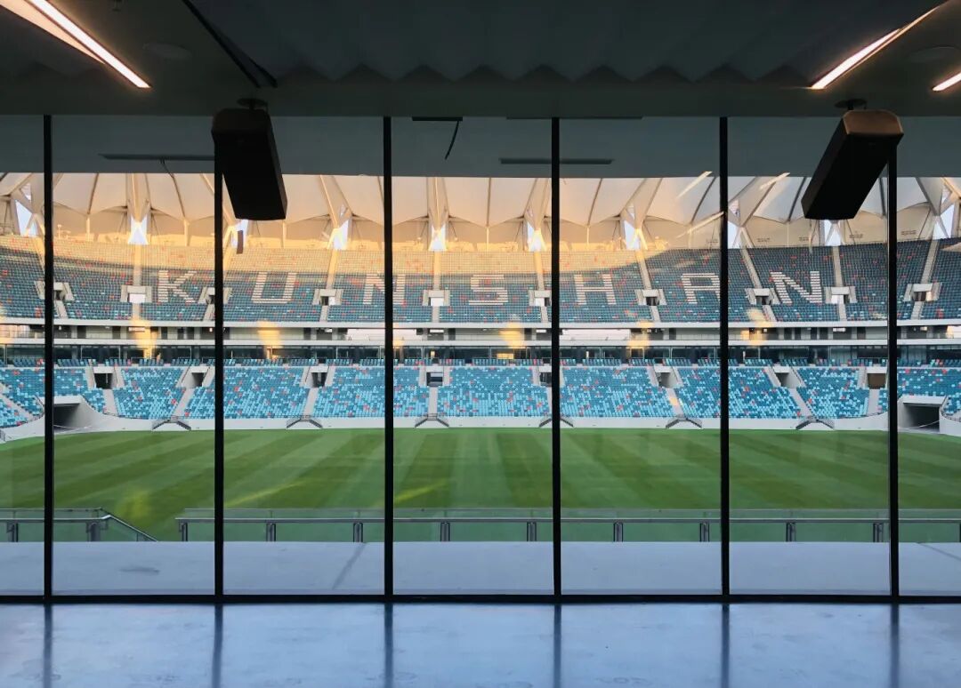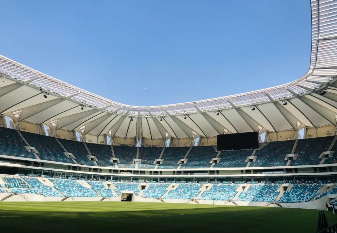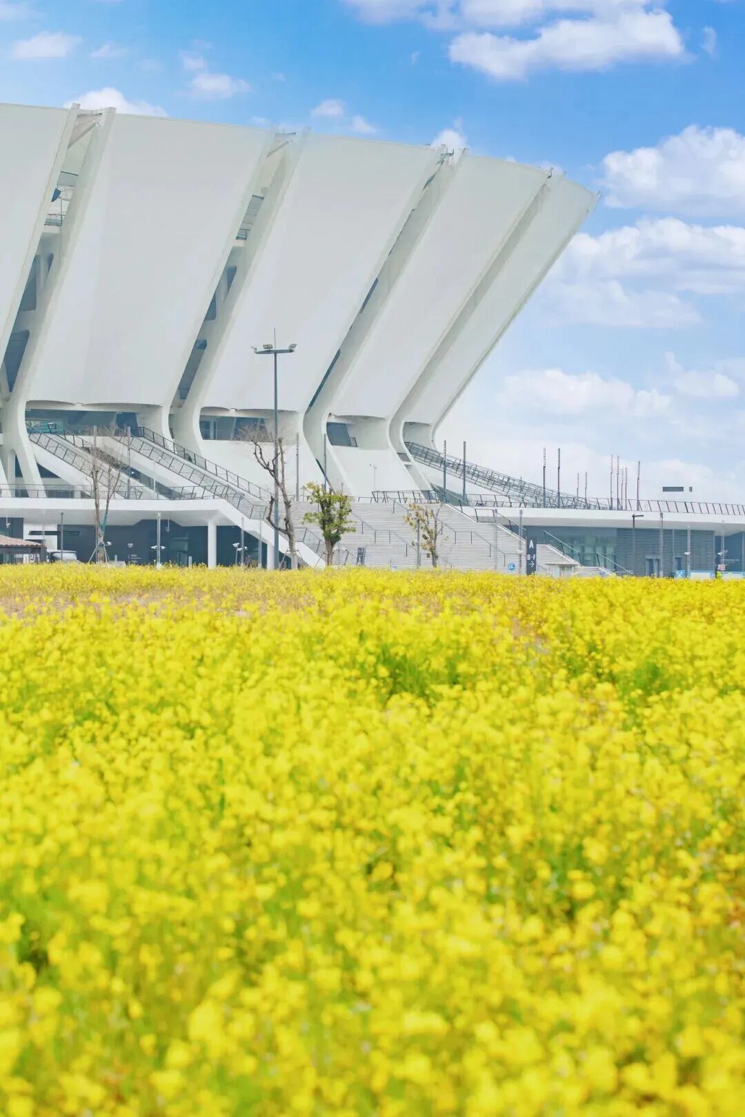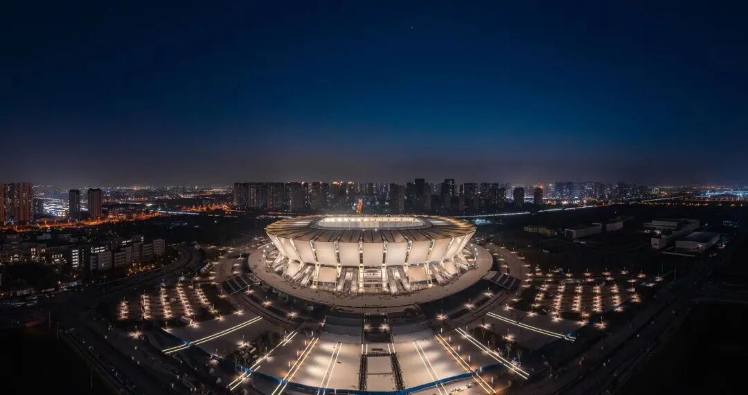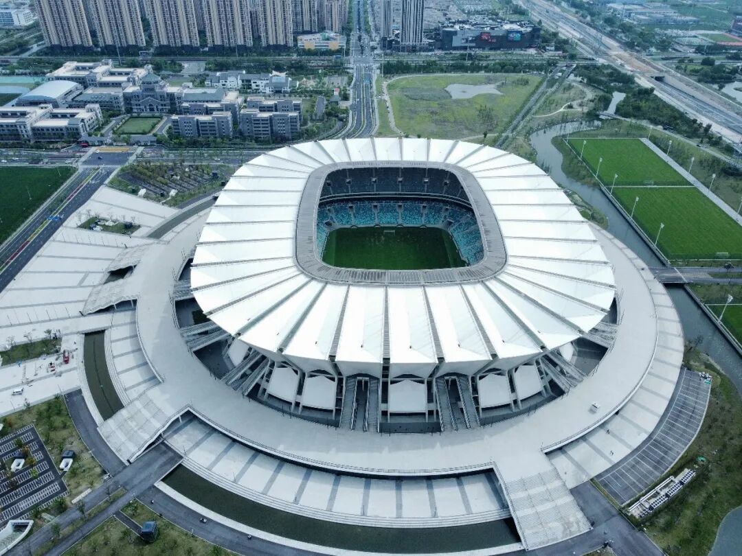场馆建筑主体融入江南诗画美学,采用扇面意象,空间开阔、环境优美,兼具颜值与内涵。相较于配置标准跑道的综合性体育场,奥体中心兼专业球场无跑道,山顶视野无遮挡, “零距离”观赛体验等优势,为球迷和观众提供更直观、更强烈地现场冲击感。