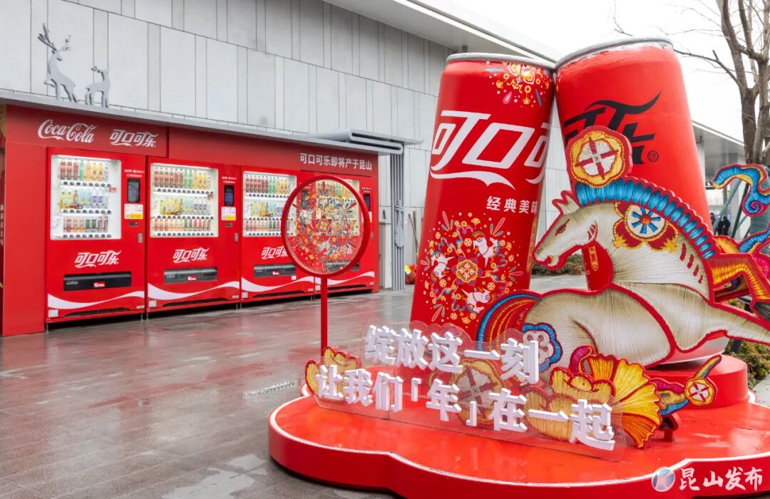 这个驿站,是正在试运营的昆山商厦·可口可乐智慧驿站。小昆看到,驿站整体采用醒目的红色调,还结合马年主题,装饰了剪纸风格的奔马造型和标语,不仅是个售卖点,还是一个有趣的打卡地。