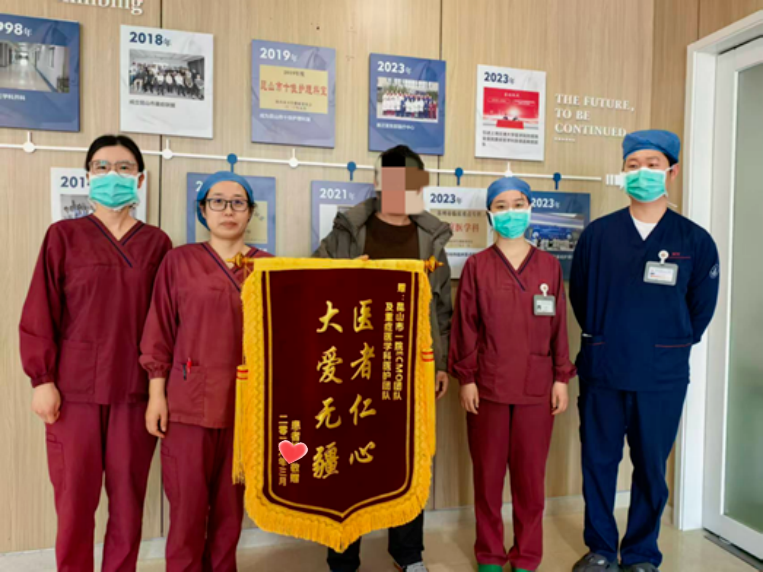 ▲患者家属(左三)向昆山市一院ECMO团队赠送锦旗