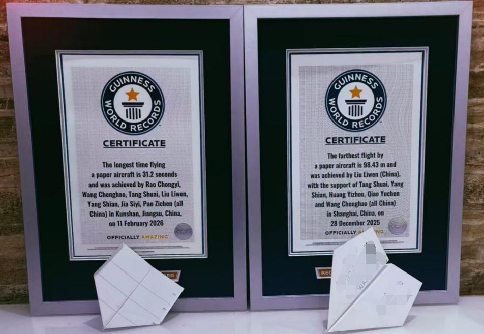 一架纸飞机在空中划出轻盈弧线,秒表最终定格在31.2秒……近日,吉尼斯世界纪录正式确认,来自中国的饶翀逸、王承昊、唐帅、刘力文、杨仕安、贾思熠、潘秭辰7人团队刷新了“纸飞机飞行时间最长”纪录。3月26日,红星新闻记者从吉尼斯世界纪录获悉,该项纪录此前由日本挑战者户田拓夫于2010年12月创造,成绩为29.2秒。这次中国的7名青年团队,凭借纸飞机31.2秒的空中滞空时长,将该项尘封15年的纪录提升整整2秒。这一成绩,是2026年2月11日,在昆山体育中心体育馆诞生的。