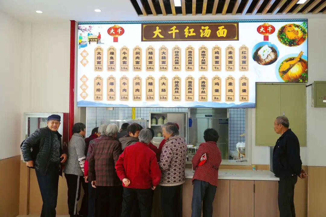 一楼核心区共设三大板块:本土特色风味区主打昆山红汤面、古法泡泡馄饨等江南经典小吃,还原地道本土味道;自选称重餐区每日供应不少于40种菜品,荤素搭配、现制现做;悦龄坊超市不仅将满足居民日常采买的便捷需求,更精选了千灯本地优质好物,开业后在家门口就能实现一站式生活采购。二楼特色区打造直选称重火锅店,食材丰富,适配多元社交场景。