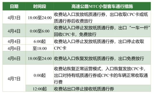 清明期间,全省收费公路对7座以下(含7座)小型客车免收通行费,免费时段是4月4日0:00至6日24:00