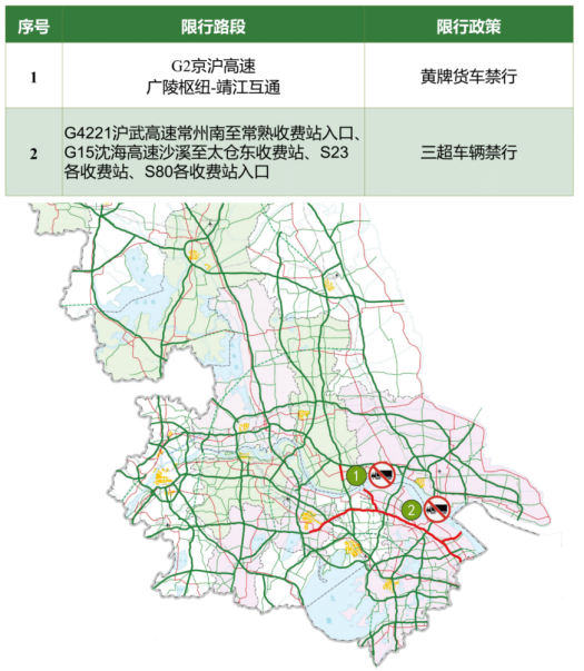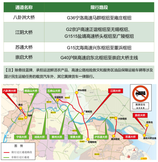 清明期间,八卦洲大桥、江阴大桥、苏通大桥、崇启大桥继续实施黄牌货车限时错峰出行政策,限行时段为4月3日12时—4月4日22时,5日、6日每日8时—22时,限行路段如图所示。