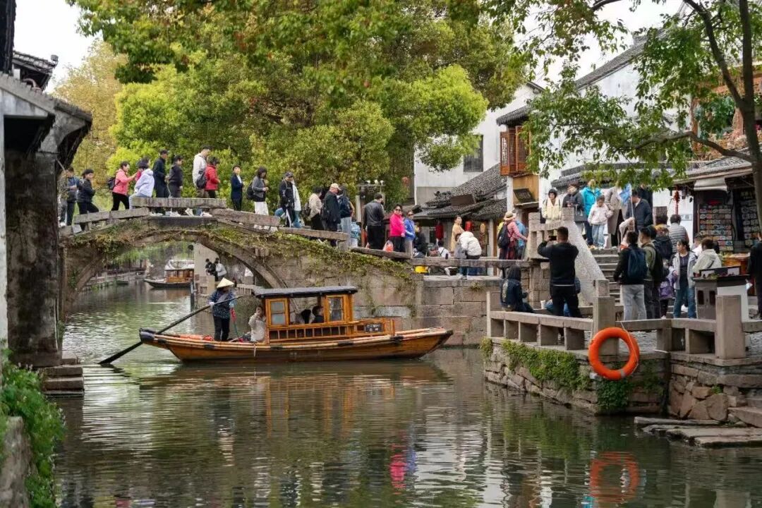 双桥是周庄古镇的地标级打卡点,由世德桥与永安桥组成一横一竖的“钥匙”形状。1984年,画家陈逸飞以双桥为题创作油画《故乡的回忆》,后背联合国选为首日封图案,周庄至此走向世界。