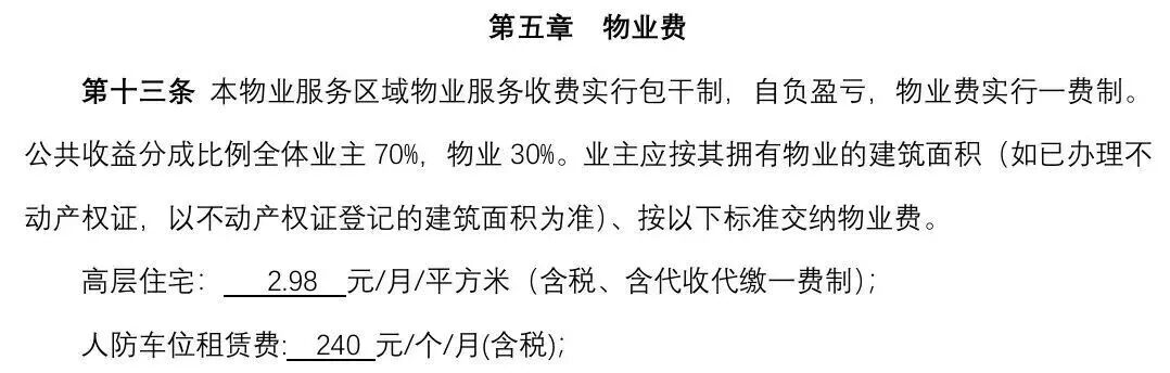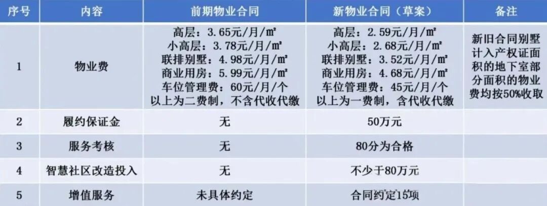 3.4元基础物业费+公共能耗费→2.9元/㎡/月一费制,车位管理费60元→ 50元/个/月。增加20万元履约保证金。