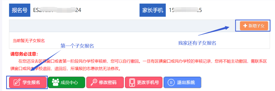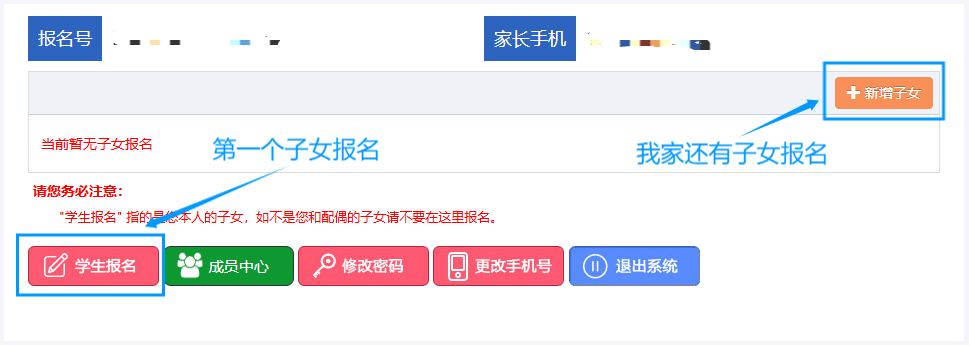如果您登录后尚未添加需要入学的子女信息,请点击【学生报名】按钮,添加需要入学的子女基本信息。选择入学的学段,填写学生姓名、学生身份证件号码,确认无误后点击【报名】按钮进行提交。