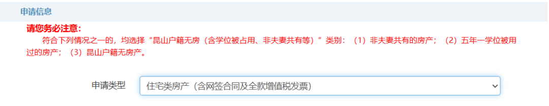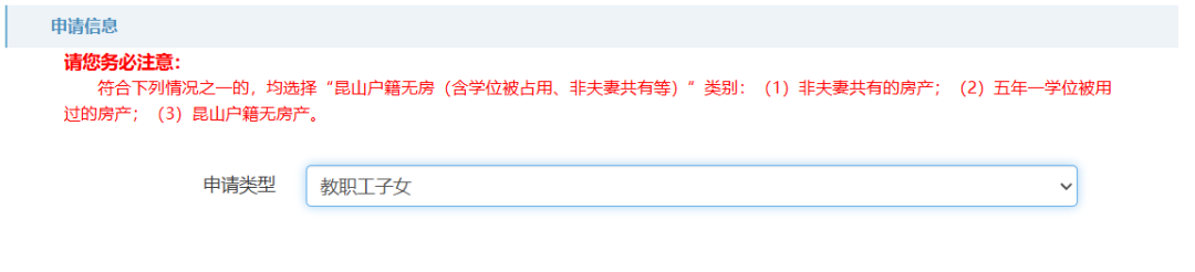 申请类型分为“住宅类房产(含网签合同及全款增值税发票)”“昆山户籍无房(含学位被占用、非夫妻共有等)”“宅基地”“房屋被征收(含商品房以旧换新)”“教职工子女”五种,申请人根据实际情况进行选择。