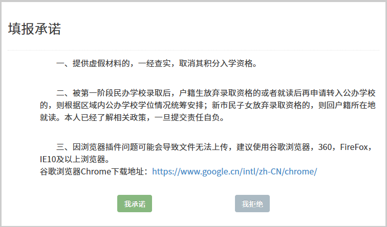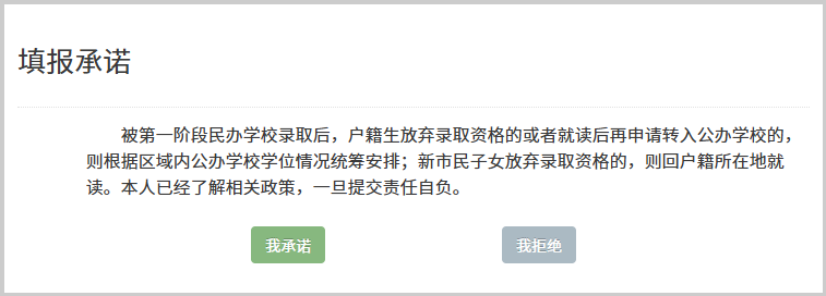 添加完入学子女的基本信息后,点击“信息填报”进入填报承诺页面,请阅读完毕之后点击“我承诺”正式进行填报。(点击“我拒绝”则返回至报名主窗口界面)