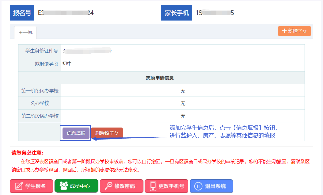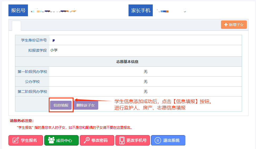 学生信息添加成功后,须点击“信息填报”按钮,进行监护人、房产、志愿等其他信息的填报。