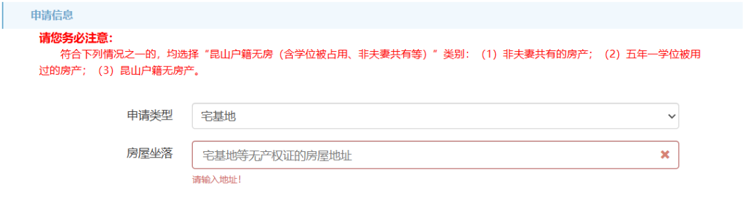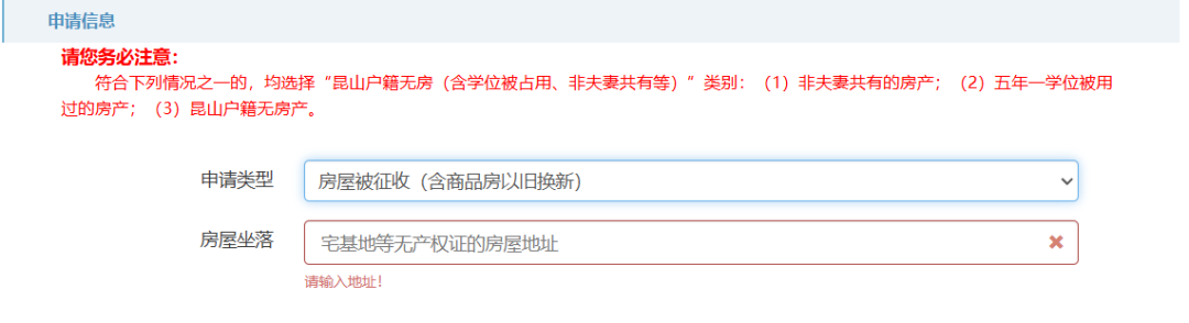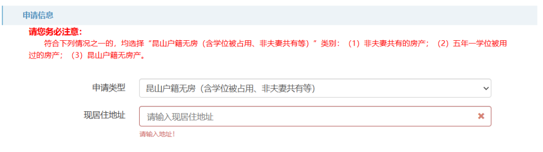 申请类型为“昆山户籍无房(含学位被占用、非夫妻共有等)”,需填写现居住地址。申请类型为“宅基地”“房屋被征收(含商品房以旧换新)”的,需填写房屋坐落。