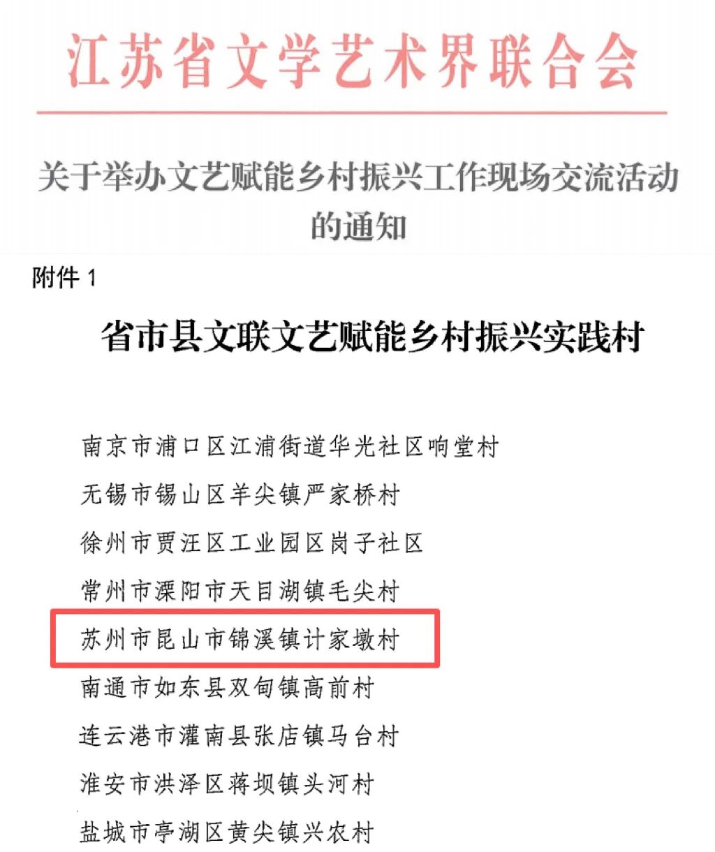 近日,锦溪镇计家墩村获评省市县文联文艺赋能乡村振兴实践村,成为苏州地区唯一获此殊荣的村落,标志着计家墩村在文艺赋能乡村振兴的探索实践中迈出了坚实一步,为锦溪全域文旅融合发展注入了新的文化活力。