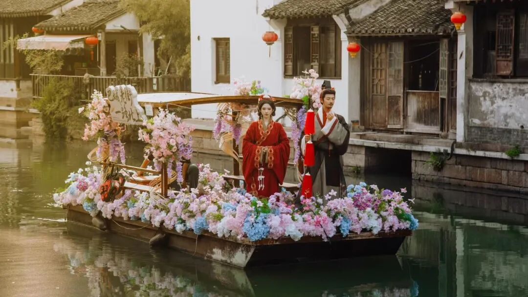 巴解园的花神巡游,以园区春日景致为背景,十二位花神身着华服、手持花枝,缓步前行;巴城老街开辟了特色的水上巡游线路,花神乘画舫缓缓游弋,华服罗裙映于碧波,再现了江南花朝盛景。