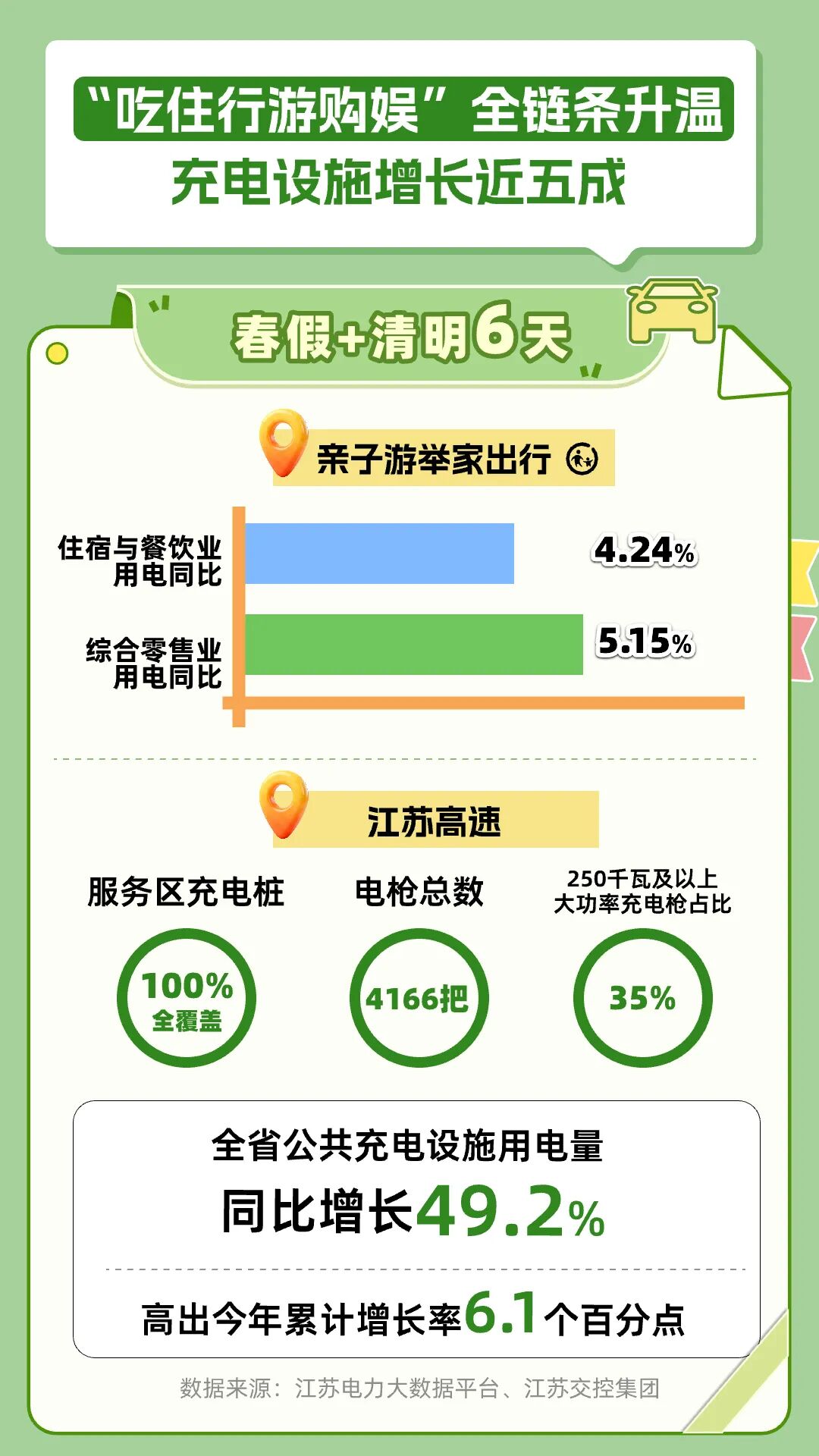 电车出游仍是热门选择,4月1日至6日,公共充电设施用电量同比增长49.2%,高出今年累计增长率6.1个百分点。为保障出行,国网江苏电力将充电保障网络延伸至出行全链条,目前全省高速服务区建设国网充电桩超3500根。