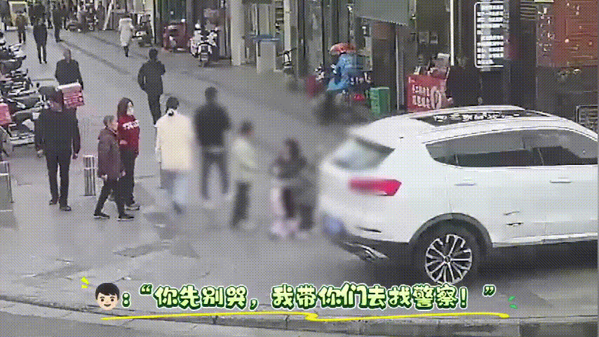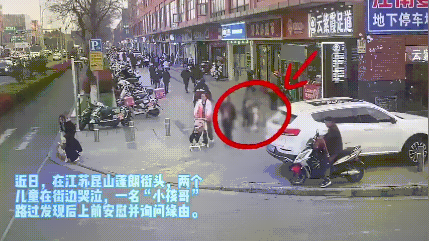 “你们怎么了?”看到小朋友在路边哭泣,“小孩哥”快步上前,得知小朋友找不到家人,他轻声安慰“哥哥带你们去找警察叔叔,然后就能找到爸爸妈妈了。”两个孩子紧紧跟在这位暖心小哥哥身边。