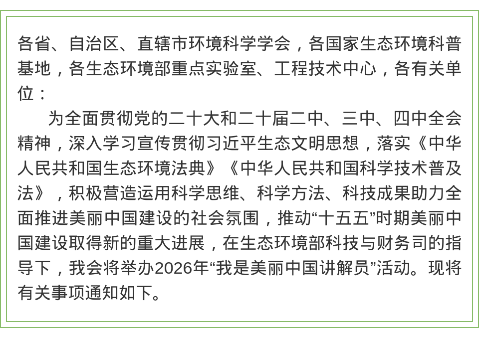 2.生态环境部部属单位,各省、自治区、直辖市环境科学学会,国家生态环境科普基地,生态环境部重点实验室、工程技术中心可直接推荐讲解员1人,短视频不超过3个。