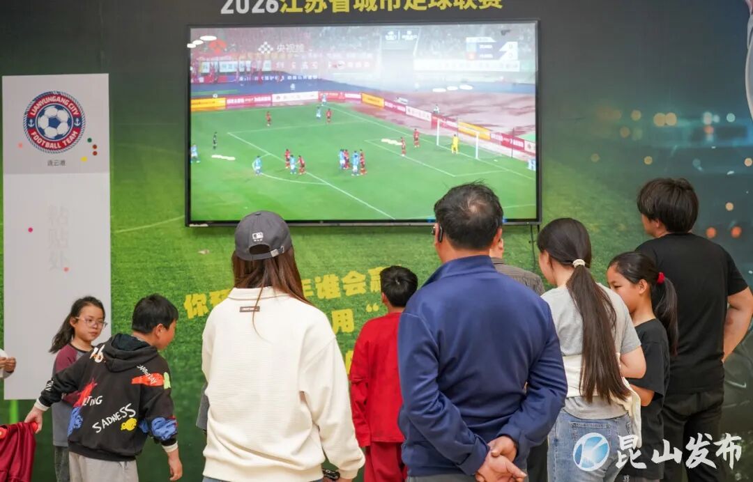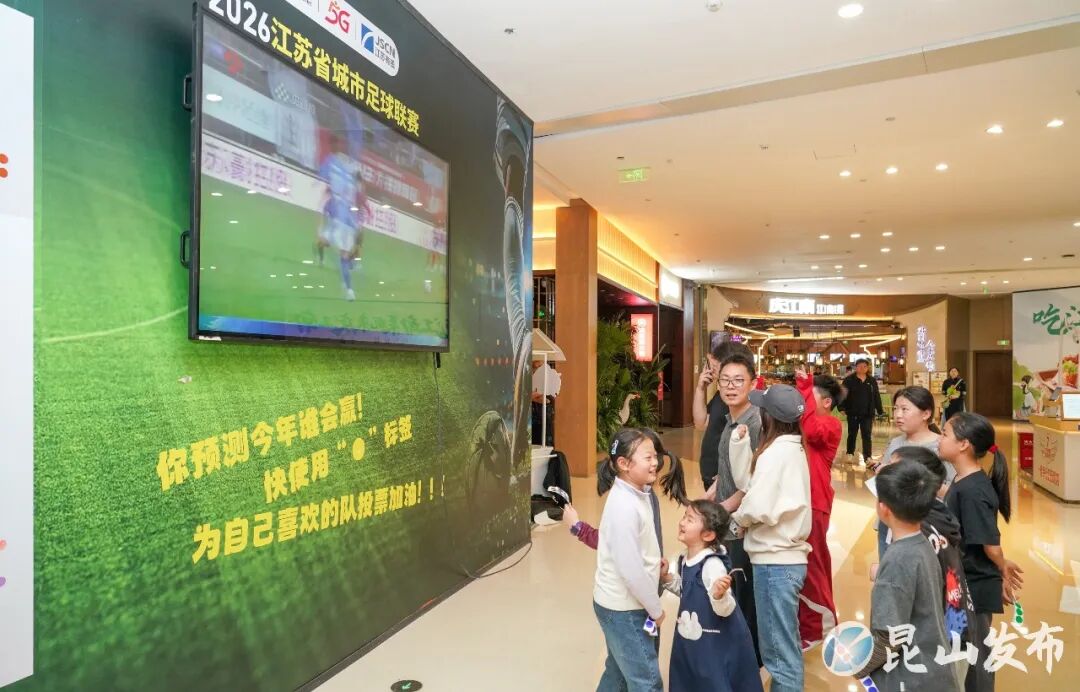 走进招商花园城,浓郁的足球赛事氛围扑面而来。巨幅的2026江苏省城市足球联赛主题海报占据了墙面核心位置,“比赛第一 友谊第十四”的标语醒目亮眼,与背景中球员驰骋绿茵的动感画面相得益彰,瞬间点燃现场热情。现场球迷兴奋地说:“不用抢票、不用奔波,在这里就能和球友一起看球、投票,这种热闹的氛围太让人沉浸了!”