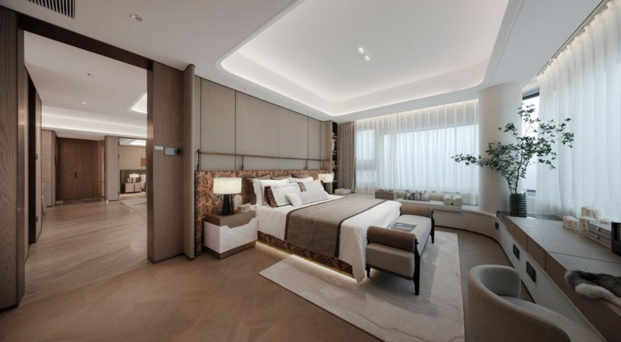 主卧270°环幕视野延伸私属风景,更为苏州人量身定制了深度睡眠屋,针对卧室门加了密封条、用静音锁阻断其他房间的噪音;在龙骨中间填充了隔音棉和隔音板,在设计之初就将电梯井道和排水管道,远离睡眠敏感区域,同步在隔音高性能系统窗上采用三玻两腔/中空夹胶等先进技术,打造“深度睡眠系统”特色IP,让回家就要睡个好觉成为日常。