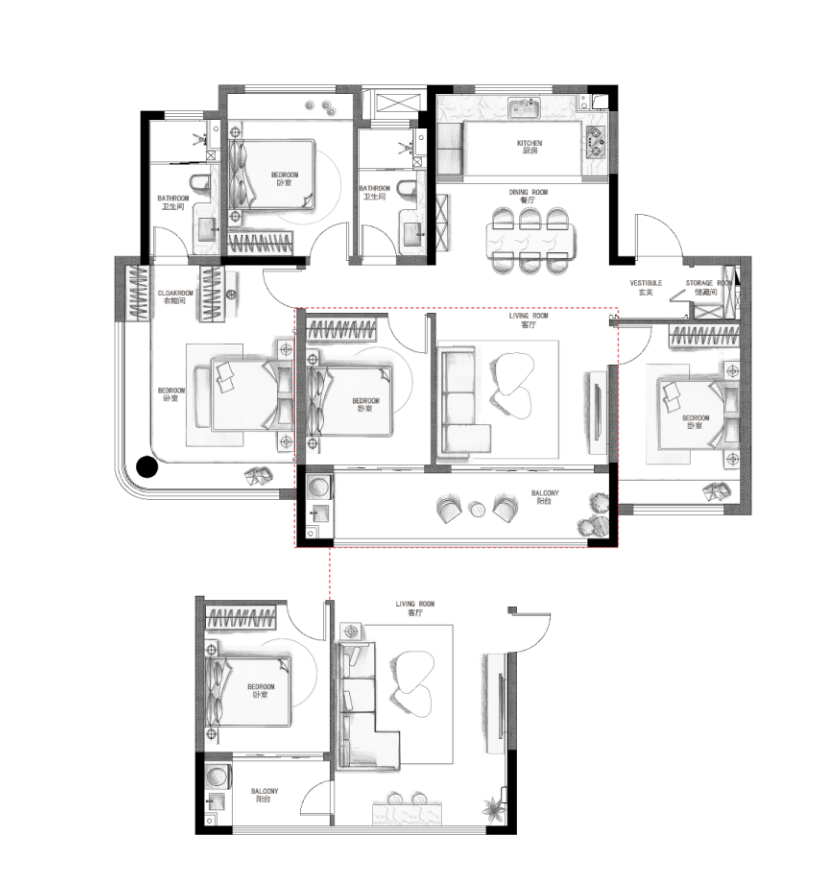 针对园区改善家庭的真实居住需求,揽序137㎡户型以空间的精准适配,完美解决日常生活痛点。以南向宽尺四开间设计, LDKB一体化布局,公共空间通透开阔,兼顾家庭互动、亲友小聚、居家办公等复合场景。独立玄关搭配800库储藏系统,满足婴儿车、行李箱、运动装备等大件物品收纳。