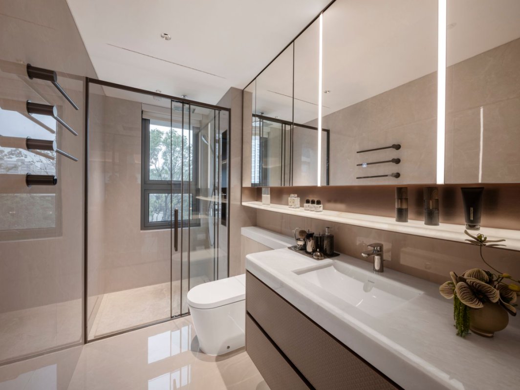 主卫更内置毫米波雷达,除雾镜柜、美妆冰柜与顶喷花洒,实用主义与仪式感兼具。全球一线卫浴名品杜拉维特、汉斯格雅等,以温润触感和无懈可击的功能让品质不分轩轾。