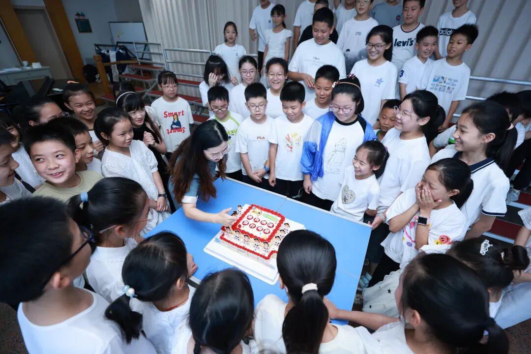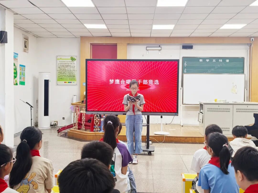 每学年选拔新成员时,五、六年级的老成员会作为评委,和老师一起去发掘有潜力的“新苗”。毕业季,他们为六年级的孩子举办温暖的欢送会,团长和声部长则由孩子们投票竞选产生。“六一”儿童节,合唱团的孩子们回到班级后成了帮助同学练习的“小师傅”,以“班班唱”的形式在操场舞台上表演,在付出中获得满满的成就感。