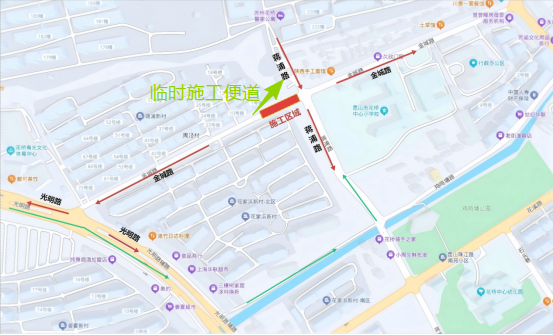 金城路周边行人及非机动车辆在原蒋浦河桥北侧临时便道上通行(绿色箭头位置),机动车辆可选择以下路线通行: