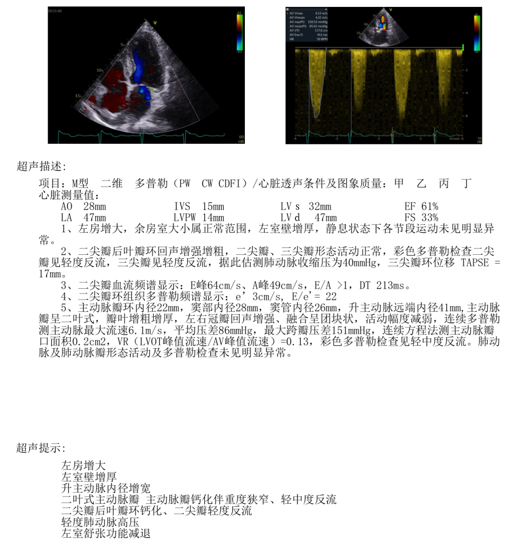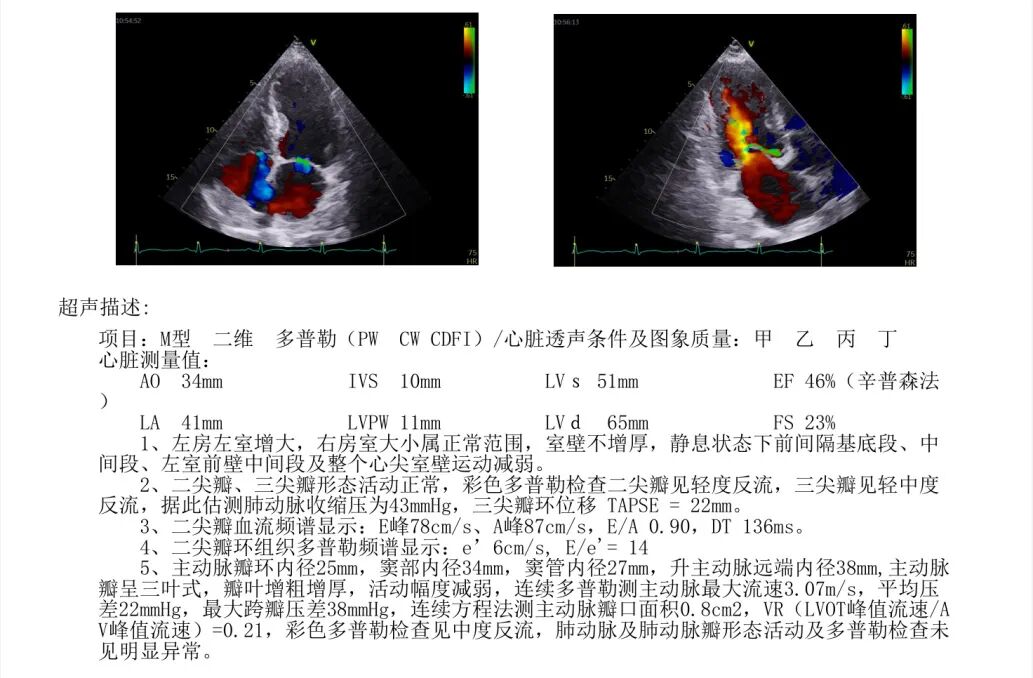 进一步检查显示,患者存在主动脉瓣重度狭窄并中度反流。超声心动图提示,主动脉瓣口面积约0.8cm²,同时伴有室壁节段性运动异常、左房及左室增大,左室收缩和舒张功能减退,左室射血分数为46%。此外,还可见二尖瓣轻度反流、三尖瓣轻至中度反流及轻度肺动脉高压。